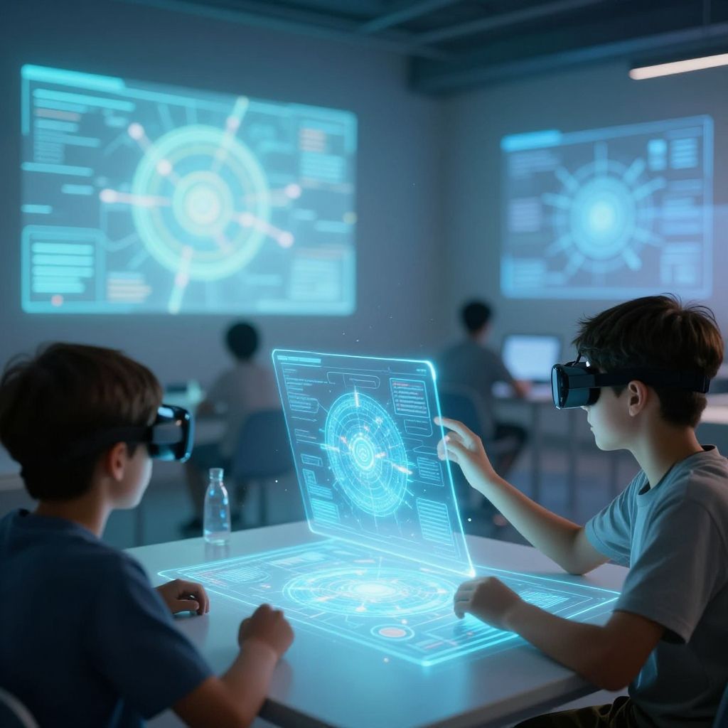 Student exploration diffusion futuristic setting, students immersed in augmented reality environments with holographic maps and immersive learning tools, soft light diffusion and detailed textures