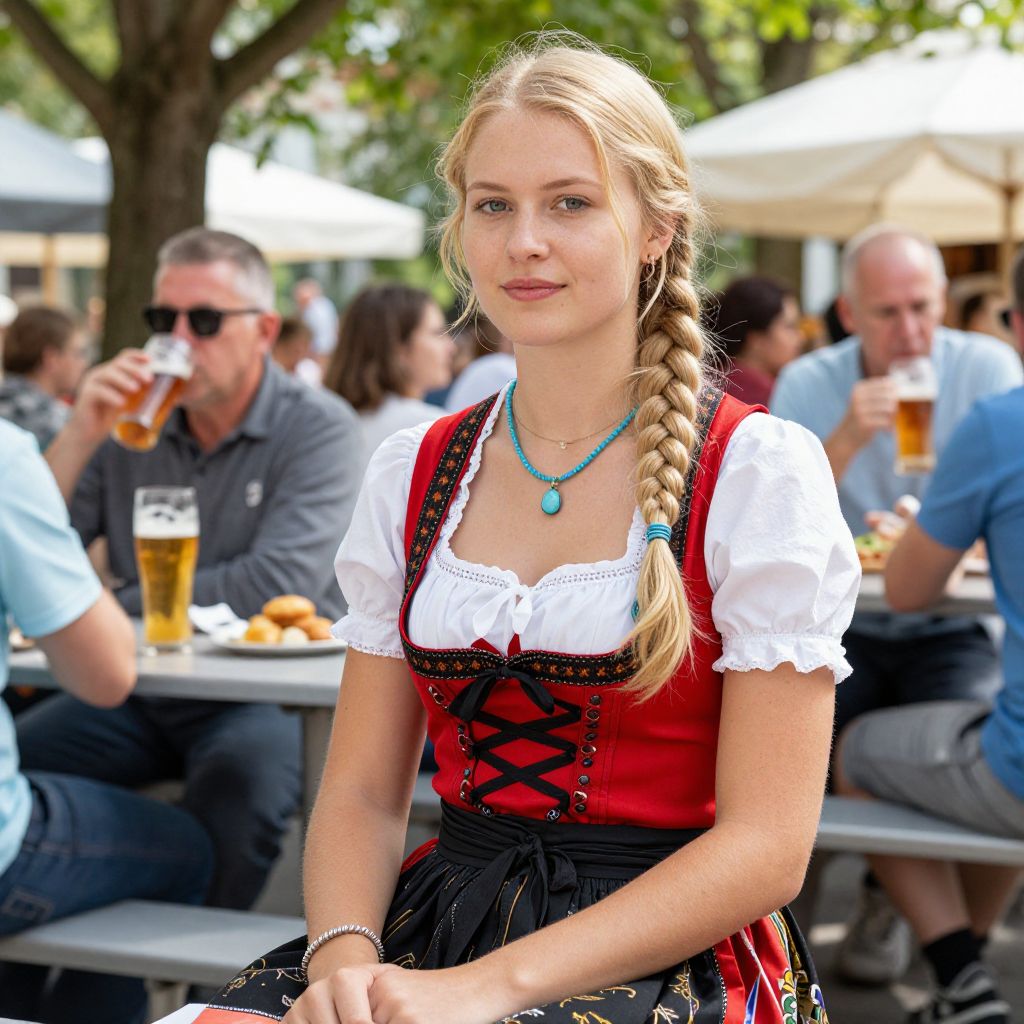 Photograph of a young blonde woman with a braid, wearing a traditional German dirndl dress with a red bodice and black apron, sitting at an outdoor beer garden table. She has a white blouse with puffed sleeves and a blue necklace. Background shows blurred people, some in sunglasses, drinking beer and eating. The scene is sunny with trees and white tents.