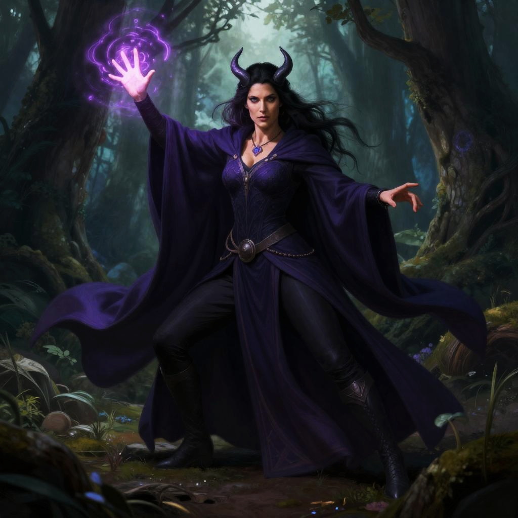 Digital fantasy artwork of a dark-haired witch with horns, in a flowing purple robe, casting a glowing purple spell in a mystical forest.