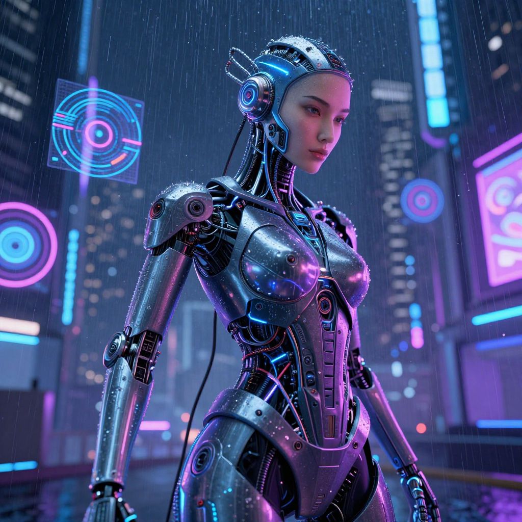 Digital CGI image of a futuristic, humanoid female robot with metallic silver armor, neon lights, and rain, standing in a cyberpunk cityscape.