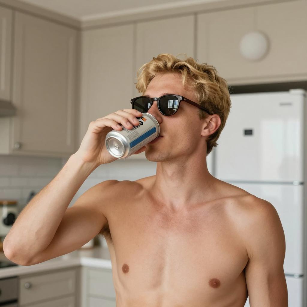 Blonde man with short hair, smiling, wearing a yellow polo shirt, light blue shorts, and white socks, sits in a wooden booth holding a beer mug. Two blurred people in the background. Brick wall and window in the background. Casual setting.