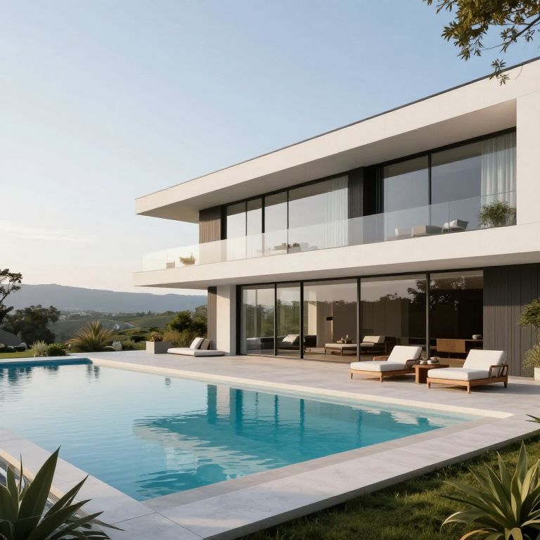 Photograph of a modern, two-story house with large, floor-to-ceiling glass windows. The house has a white exterior with a flat roof overhang. In the foreground, there is a rectangular, blue-tiled swimming pool with clear water, surrounded by a white concrete deck. Four beige lounge chairs with white cushions are positioned near the pool. The background includes a lush, green landscape with trees and distant hills under a clear, blue sky. The house's balcony, accessible via glass doors, has potted plants. The overall style is minimalist and contemporary.