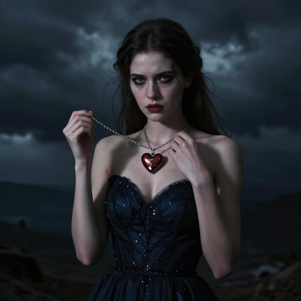 Cruel wife holding a broken heart necklace, dark and stormy background, elegant evening gown, piercing cold eyes, emotional tension, realist portrait style