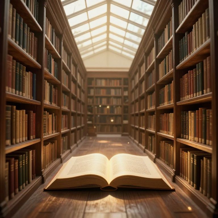 Photograph of a library aisle with tall, wooden bookshelves on both sides, filled with neatly arranged, colorful books. The aisle leads to a bright, sunlit, skylit roof at the end. In the center, an open, large, illuminated book rests on the polished wooden floor, casting a warm, golden glow. The image has a shallow depth of field, focusing on the open book while the background bookshelves are slightly blurred. The atmosphere is serene and scholarly, with an emphasis on knowledge and reading.