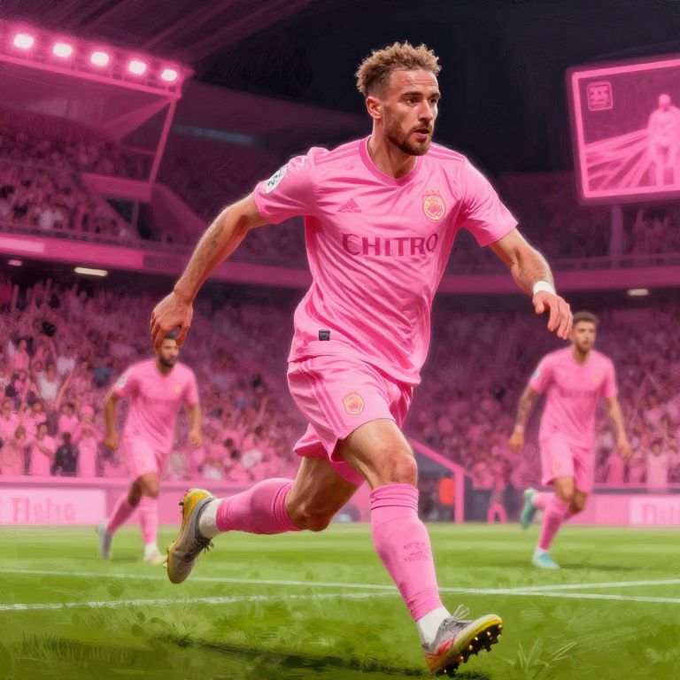 Griezmann pink themed digital painting, futuristic soccer scene with pink holographic elements, animated crowd, intense action shot, vivid pinks blending with dark contrasting background, high detail, stylized realism