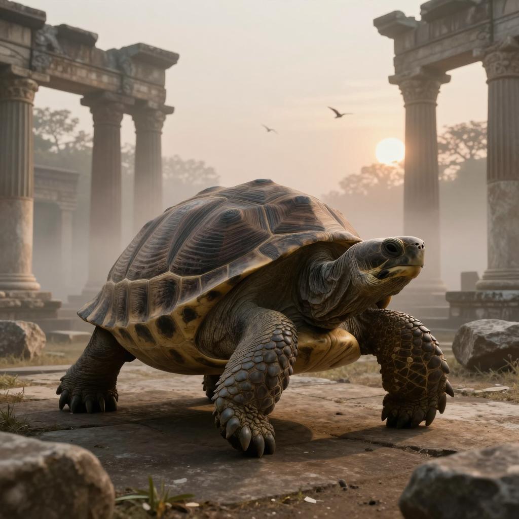 Hyper-realistic image of a giant turtle walking across ancient stone ruins shrouded in early morning mist. The scene features detailed textures on the turtle's shell and skin, classical columns with weathered stone, and a soft sunrise sky with birds flying in the background. Cinematic lighting with a 60mm lens effect captured in 8K resolution.