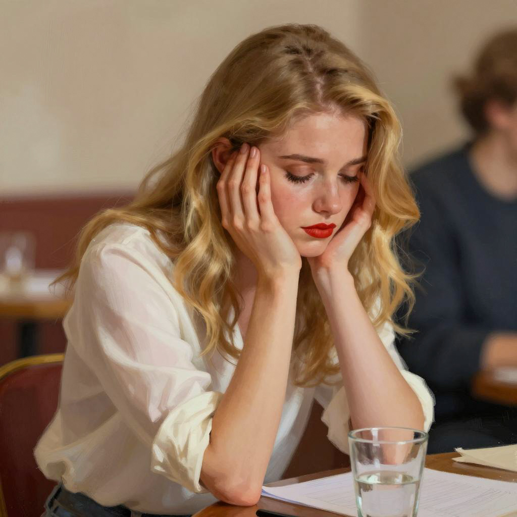 Digital painting of a blonde woman with long, wavy hair, fair skin, and red lipstick. She sits at a table with a glass and papers, head in hands, looking down with a sad expression. Wearing a white shirt with rolled-up sleeves. Background is blurred with warm colors. Another person is partially visible in the background. Brushstrokes are visible, creating a ured effect.
