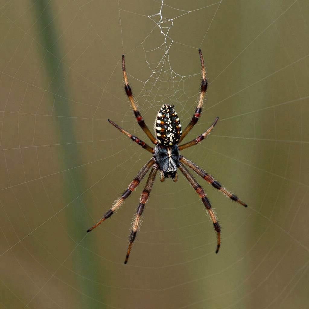 Realistic spider drawings capturing the fine silk threads of the web and the spider's delicate movements, rendered with photorealistic attention to detail in an outdoor setting with subtle reflections on the spider's body.