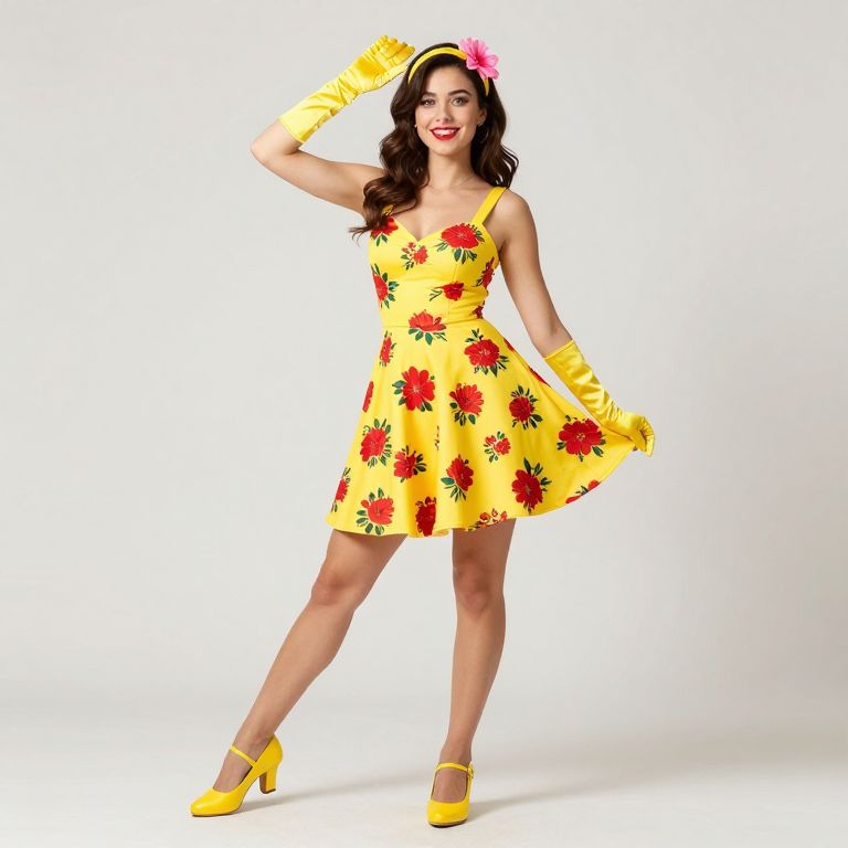 Energetic retro Go-Go girl donning a vibrant yellow dress adorned with red floral patterns, complemented by matching yellow gloves, shoes, and a headband featuring a pink flower, striking a playful pose against a plain background.