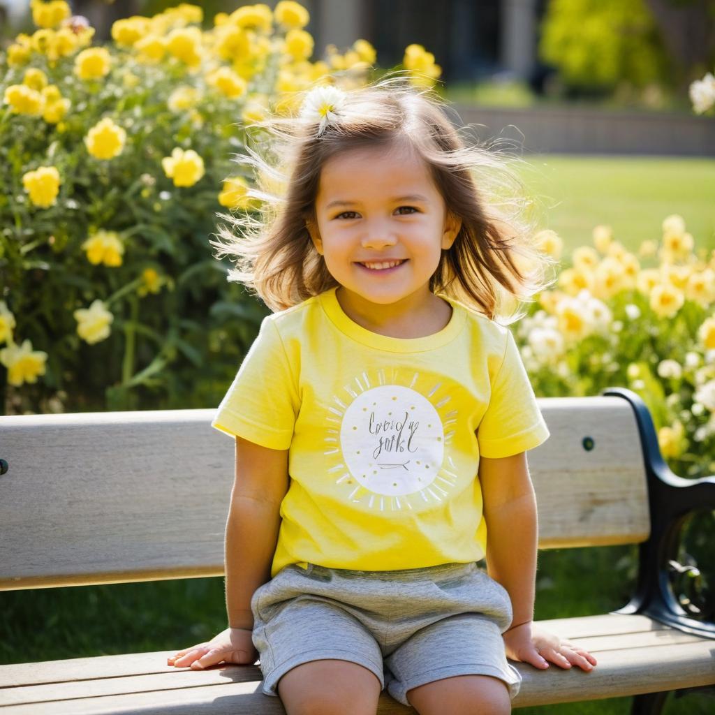 Portrait of a young girl with light brown hair wearing a yellow t-shirt with a smiling sun graphic and grey shorts, sitting on a park bench next to a pot of bright yellow flowers. The setting is outdoors in a sunlit park with a soft, warm atmosphere.