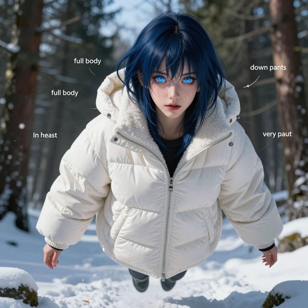 ((((white Oversized shearling padded down jacket)))), ((((white Oversized shearling padded puffer jacket)))), ((((white Oversized shearling padded down coat)))), ((((white Oversized shearling padded puffer coat)))), ((((Oversized shearling padded winter clothes)))), ((((very very hot)))), ((((full body)))), ((((standing)))), ((((down pants)))), ((((puffer hood up)))), ((((puffer mask)))), ((((very sweat)))), ((((very sweaty clothes)))), ((((sweating profusely)))), ((((heavy breathing)))), ((((in heat)))), ((((in orgasm)))), ((((excited)))), (((outdoors, forest, winter, daytime, sunlight))), dominatrix, ((extremely detailed CG unity 8k wallpaper)), masterpiece, best quality, ultra-detailed, best shadow, ((detailed background)), ((beautiful detailed face)), beautiful detailed eyes, ((best illumination)), an extremely delicate and beautiful), ((((cinematic light)))), colorful, hyper detail, ((illustration)), floating, dramatic light, intricate details, ((1 girl)), solo, (blue sky eyes, sharp eye, eyeliner, eyelashes, sharp face), dark blue hair, hair between eyes, earrings, glowing eyes, mole under mouth, (Thick padded cuffs:1.4), (Thick padded collar:1.4), (TSH:1.4)