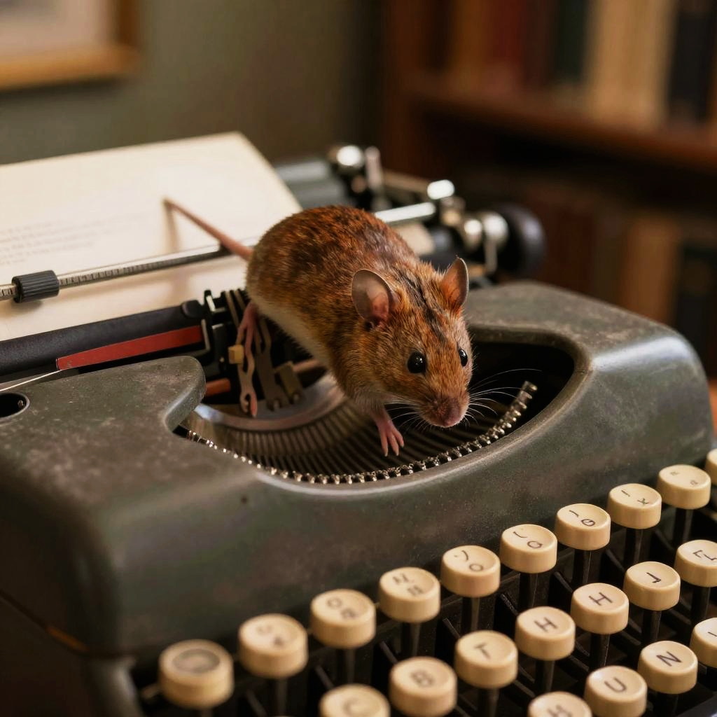 Mouse with brown hair perched on a vintage typewriter, old library ambiance, warm golden lighting, detailed textures, gentle and nostalgic atmosphere