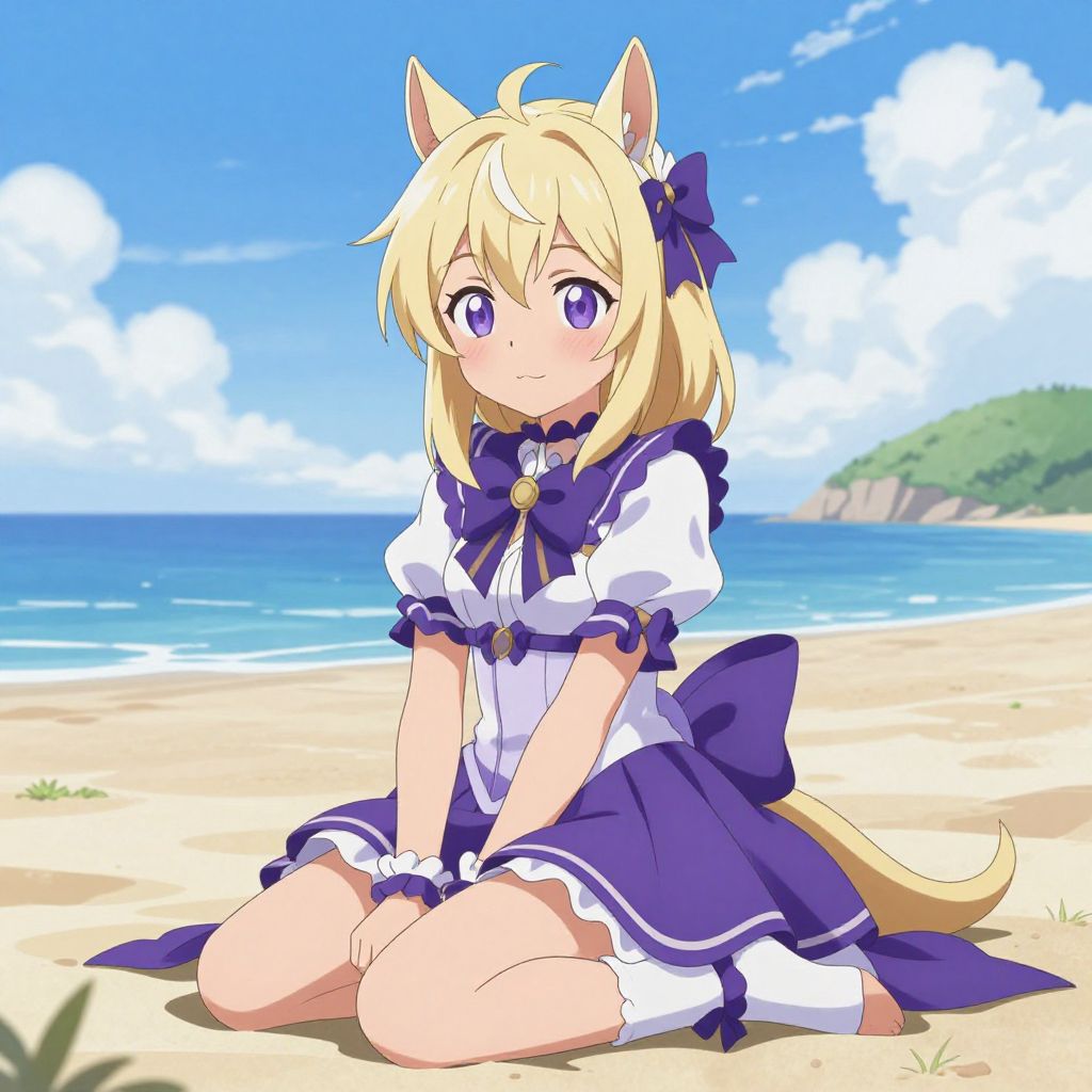 Digital anime-style drawing of a cute, blonde, anime girl with horse ears and tail, sitting on a sandy beach. She has large, purple eyes and wears a blue and white sailor-style dress with a large bow, white puffed sleeves, and a golden bell at the collar. Her hair is adorned with a blue ribbon. The background features a bright blue sky with fluffy white clouds, the ocean with gentle waves, and a distant green cliff. She is kneeling with her hands on her lap, smiling gently. The image is vibrant with clean lines and a sunny, cheerful atmosphere.