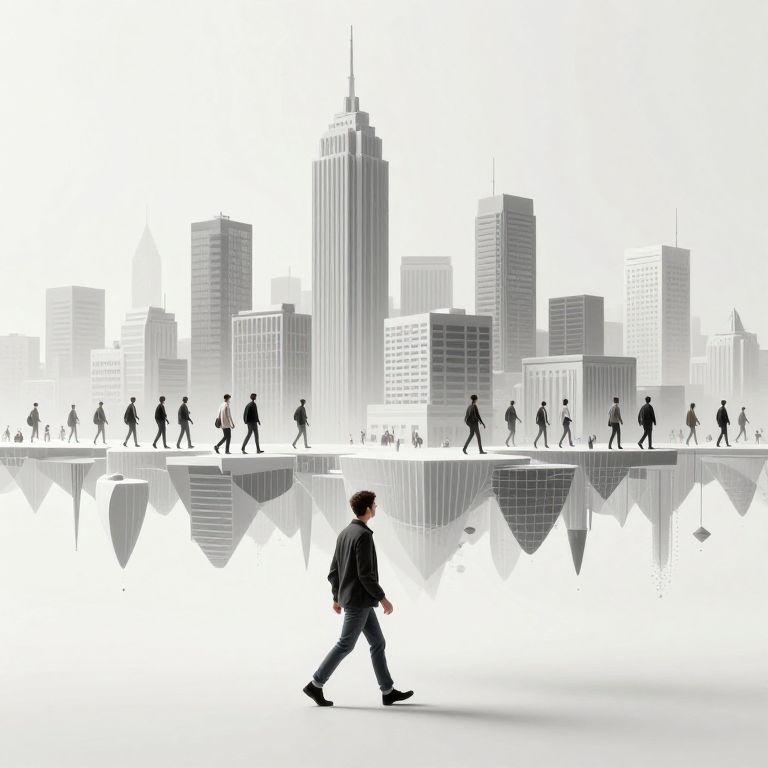Silhouette of a businessman walking in front of a black-and-white cityscape with numerous people walking across a reflective surface. Digital illustration.
