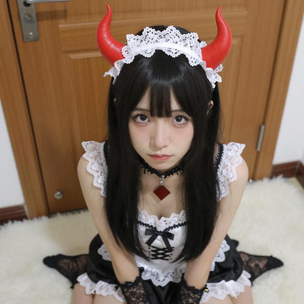 Photograph of an Asian woman in a black and white maid costume with a horn headpiece, facing away, showcasing her large, bare buttocks. She wears white gloves, black thigh-high stockings with lace trim, and a white lace headband. She is bent over a dark wooden chair in a brightly lit room with white walls and a door in the background.