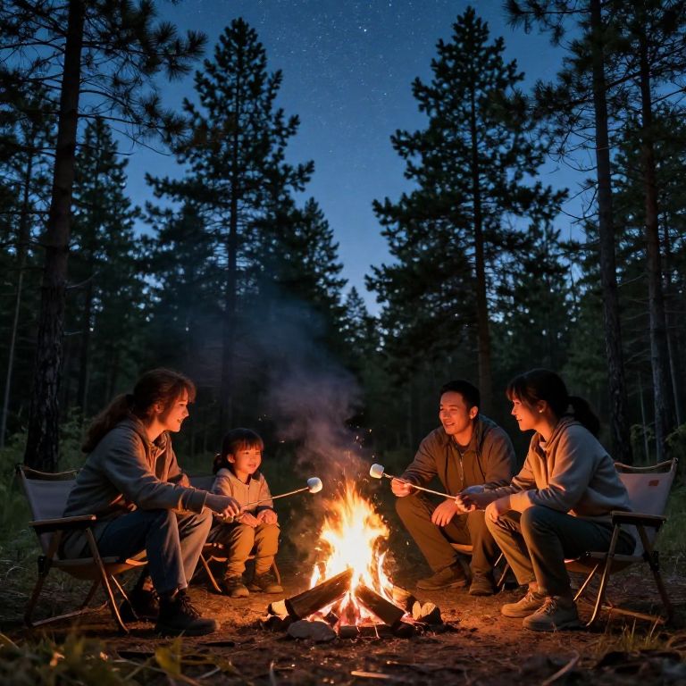 A family gathered around a campfire at dusk, with marshmallows roasting on a stick, surrounded by tall pine trees and a starry sky above