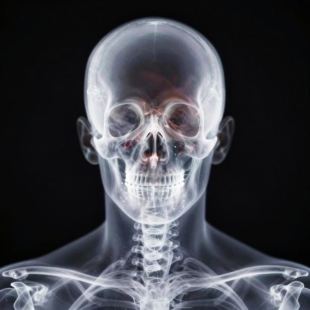 X ray photo effect online, abstract portrait of a person with X-ray effect revealing skull and facial bones, soft glowing edges against a dark, minimalist background, digital art blending anatomy and technology in a visually striking manner