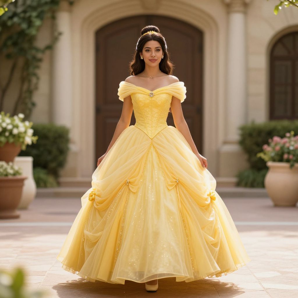 "Yellow Princess Dress Disney, a woman in a yellow dress standing in a courtyard"