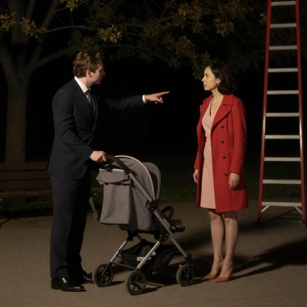Night scene photograph. Man in dark suit points to a woman in pink dress and red coat standing beside a covered stroller. Dark trees, bench, and red-striped ladder in background. Man's hand outstretched, woman's focused expression. Stroller with blanket. Shadows on ground.