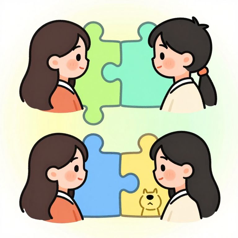 Digital drawing of two pairs of cartoon-style girls with simple, round facial features and black dot eyes. The top pair, with a green and yellow puzzle background, has one girl with dark brown hair in an orange shirt and the other with black hair in a ponytail and a white shirt. The bottom pair, with a blue and yellow puzzle background, features the same dark brown-haired girl in orange and a new black-haired girl in white. All characters have light pink blushes. The background is white, emphasizing the colorful puzzle pieces. The style is cute and minimalist.