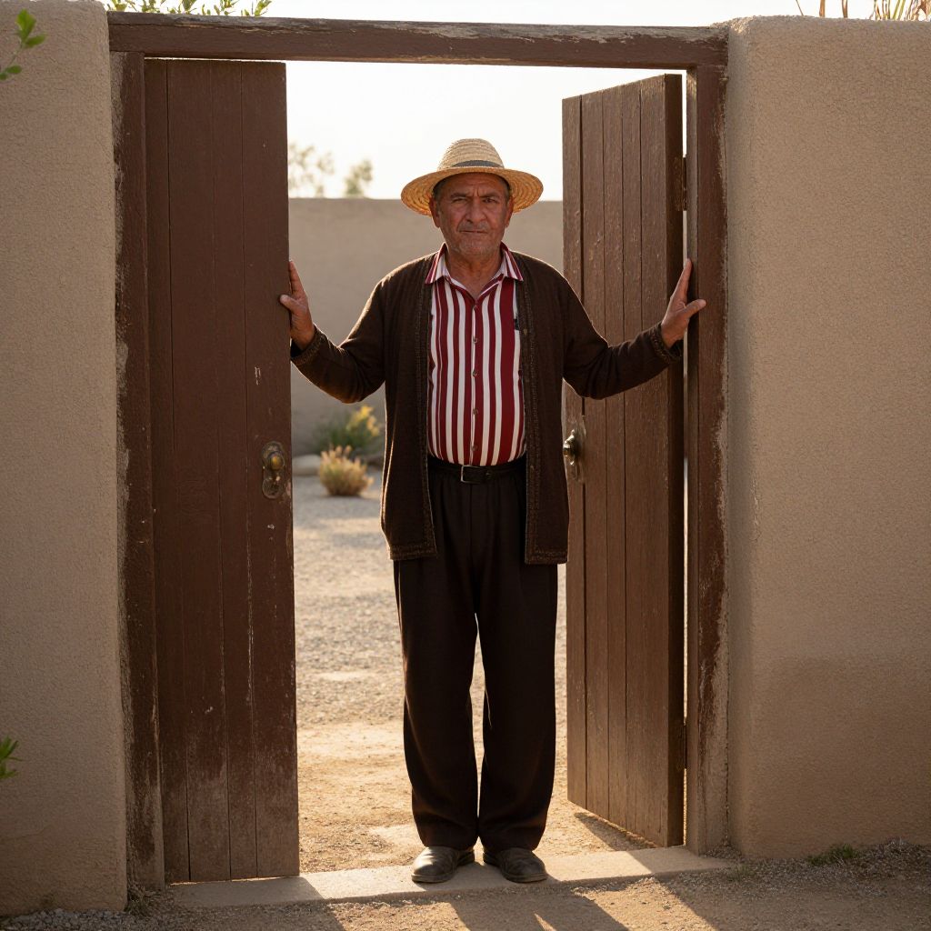 Photograph of an elderly Caucasian man standing in a partially open wooden door, bathed in warm sunlight. He wears a straw hat, black jacket, red and white striped shirt, and black pants. He stands with arms outstretched, holding the door frames. The background features a beige stucco wall, gravel path, and blurred desert plants. The man has a slight smile and wears glasses. The door and wall textures are rough, contrasting with his smooth, neatly dressed appearance. Light filters through the open door, casting shadows on the ground. The overall scene conveys a welcoming, rustic ambiance.