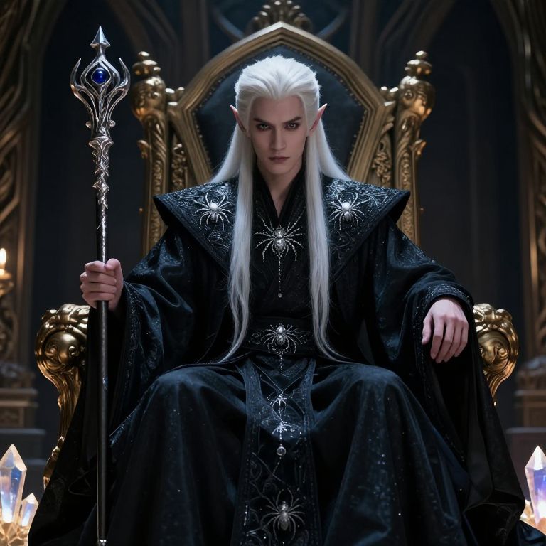 A digital CGI image depicts a tall, pale-skinned, elf-like male with long, straight white hair and pointed ears, seated on an ornate golden throne. He wears a black, intricately embroidered robe with silver spiderweb patterns, and holds a silver, ornate staff in his right hand. His expression is stern and focused. The background is dark with subtle gothic architecture and glowing crystals at the base of the throne, adding a mystical ambiance. The overall style is fantasy, with a dark, magical, and regal feel.