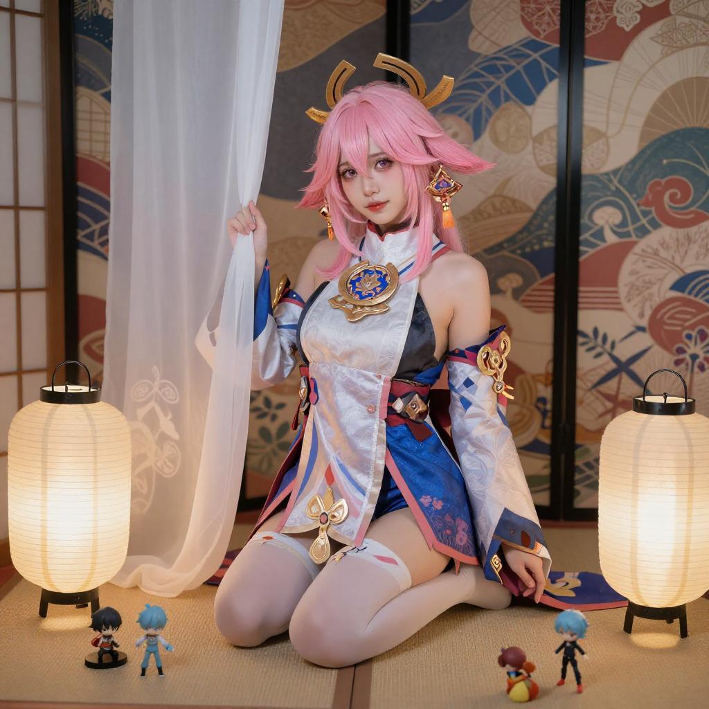 A pink-haired anime woman in a blue and white ornate outfit with gold accents kneels on a carpeted floor, surrounded by two glowing paper lanterns and a traditional Japanese-style wall mural. She holds a white curtain, with scattered small figurines and a black table in the foreground.