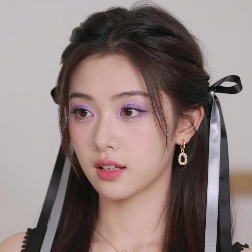 Portrait of a young Asian woman with light skin and braided brown hair, wearing a silver medieval-style armored suit and black gloves. She holds a large sword with a gold crossguard close to her right cheek, looking with intense, focused eyes against a dark background.