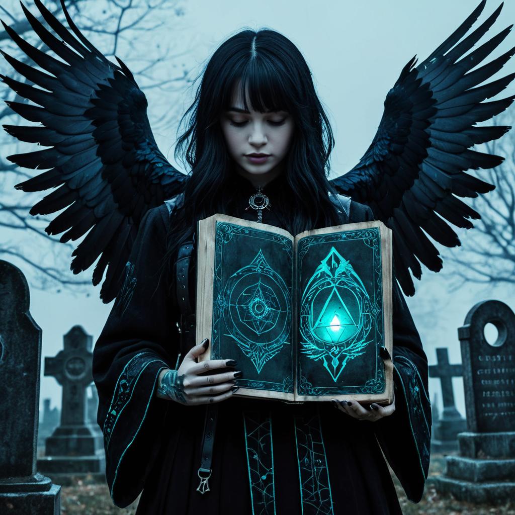 Cyber Witch with Electrified Magic Tome in Neon Forest