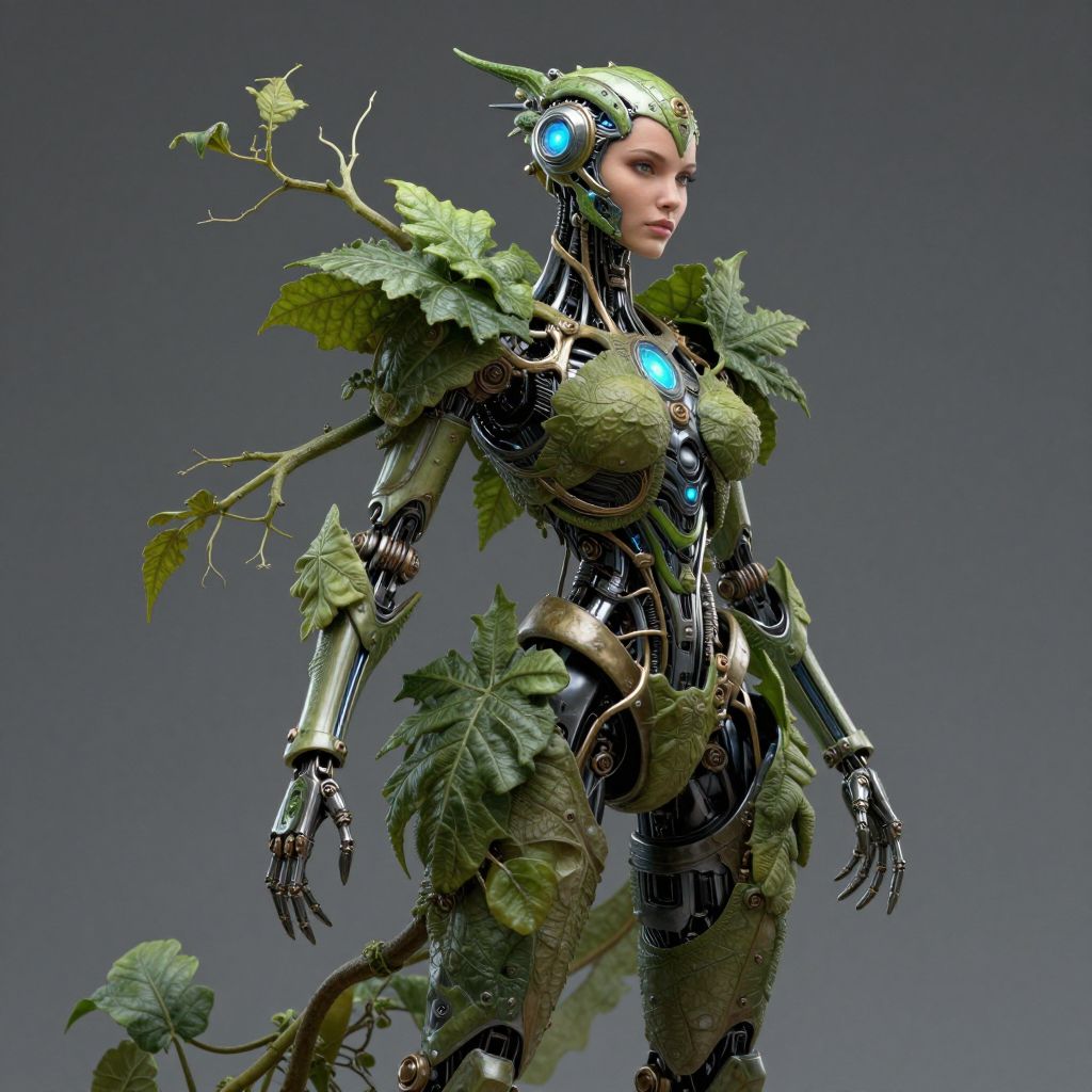 A digital CGI image of a female humanoid robot with a sleek, metallic body adorned with green leaves and vines. She has a futuristic, cybernetic head with blue glowing circular accents. Her torso and limbs are metallic, while the leaves cover her shoulders, chest, and hips. Her arms and legs are articulated, with visible joints. The background is a gradient from dark to light gray, emphasizing the character's intricate design and blending of organic and mechanical elements. The overall style is a blend of sci-fi and nature, highlighting the fusion of technology and biology.