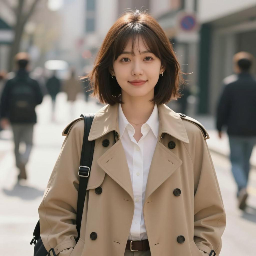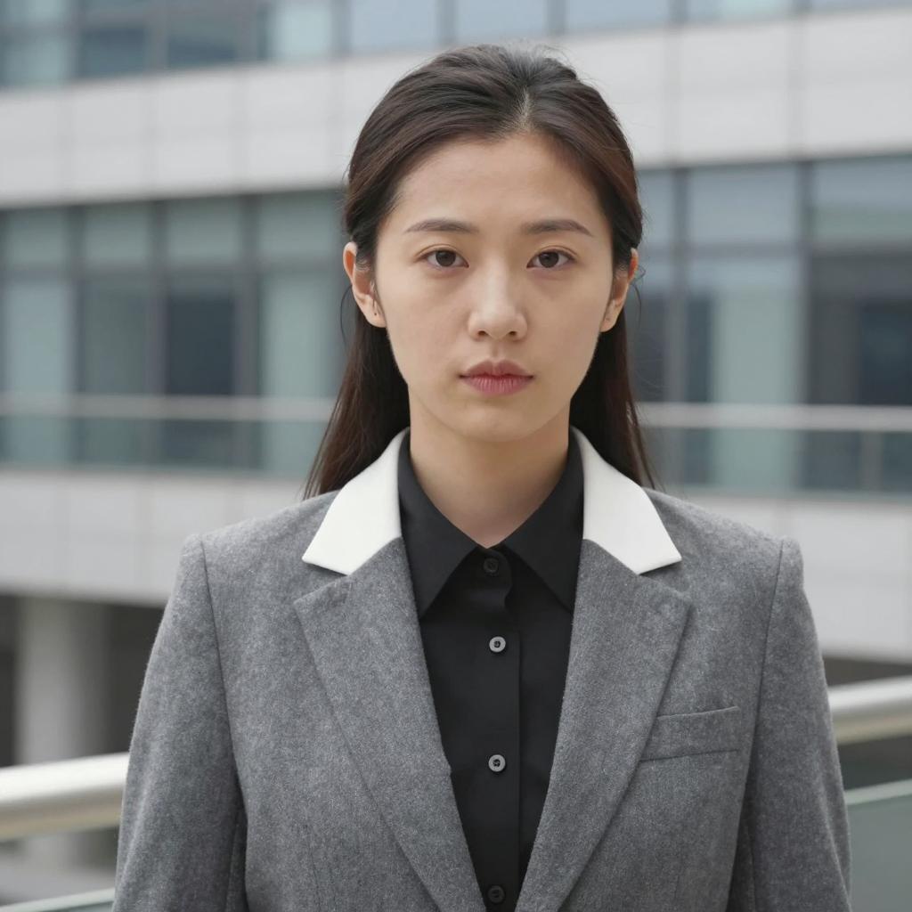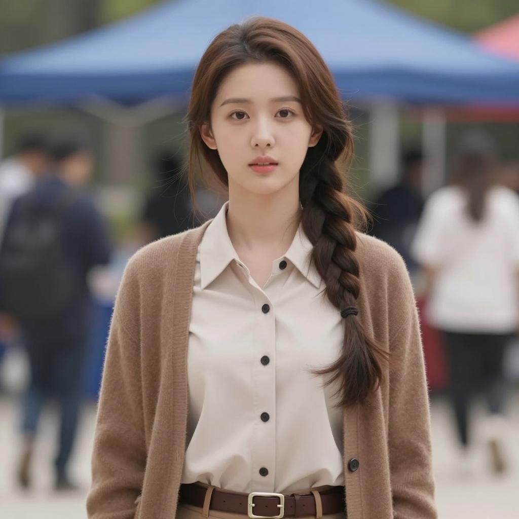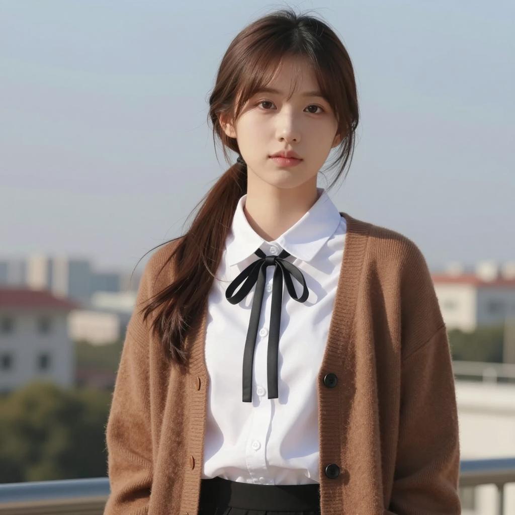 Woman cardigan sweaters, photograph of a young woman, standing outdoors, daytime, slightly blurred background, focused on her, wearing a dark gray cardigan, black button-up shirt, white belt with a silver buckle, light brown hair in a loose ponytail, natural makeup, serious expression, soft sunlight, urban setting, shallow depth of field, casual attire, slightly warm lighting, subtle bokeh effect in background