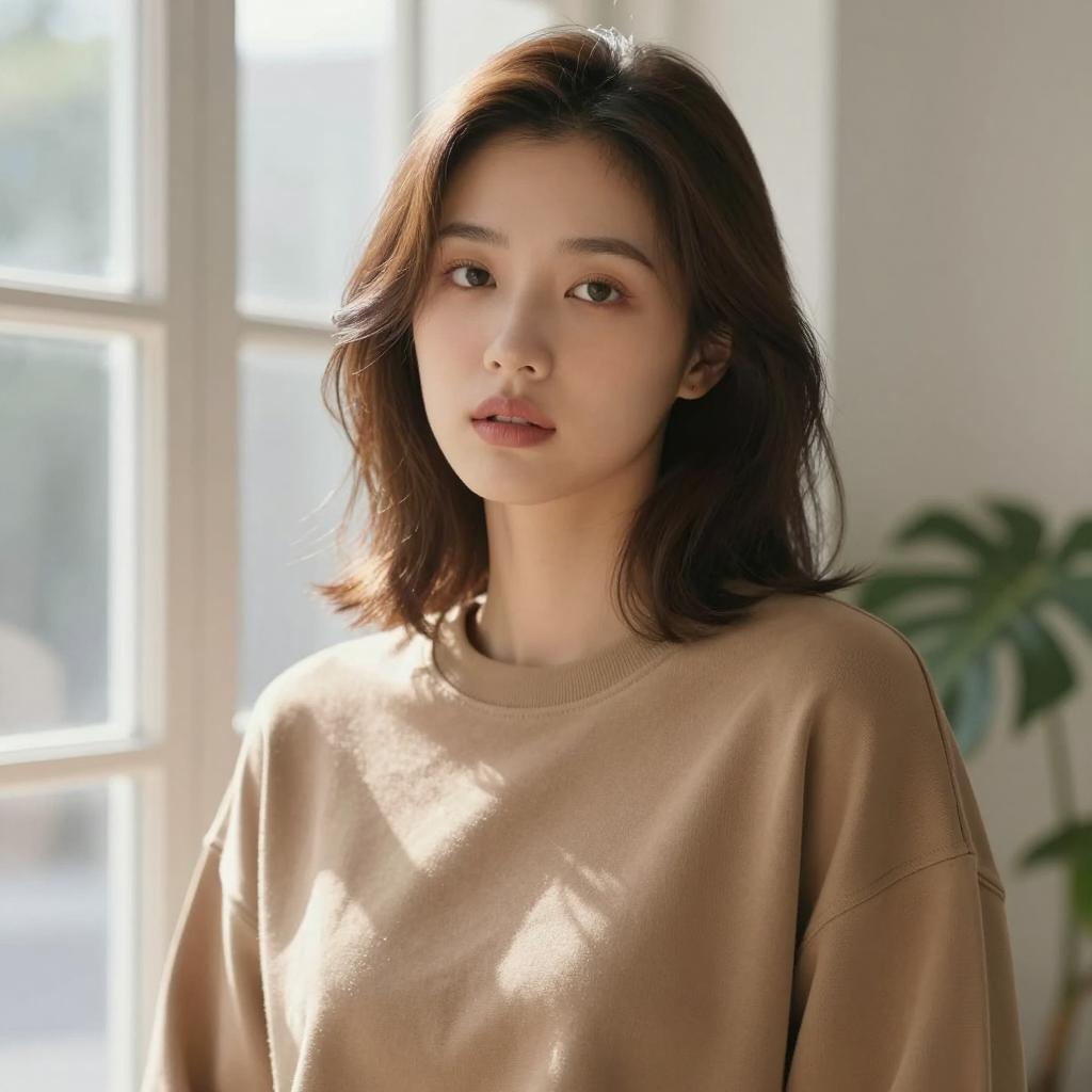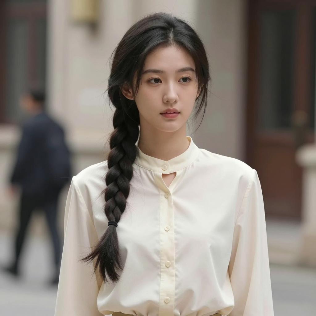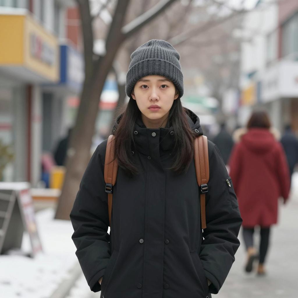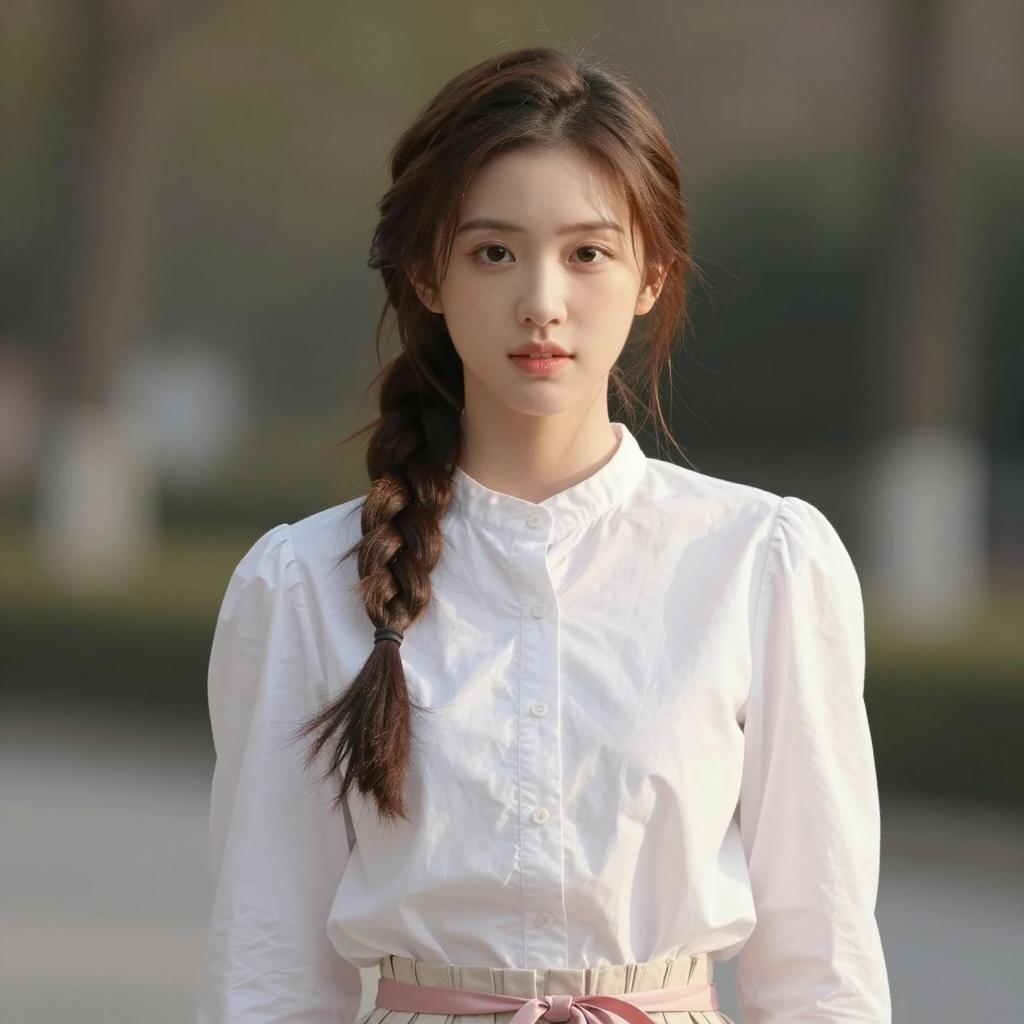 Woman cardigan sweaters, photograph of a young woman, standing outdoors, daytime, slightly blurred background, focused on her, wearing a dark gray cardigan, black button-up shirt, white belt with a silver buckle, light brown hair in a loose ponytail, natural makeup, serious expression, soft sunlight, urban setting, shallow depth of field, casual attire, slightly warm lighting, subtle bokeh effect in background