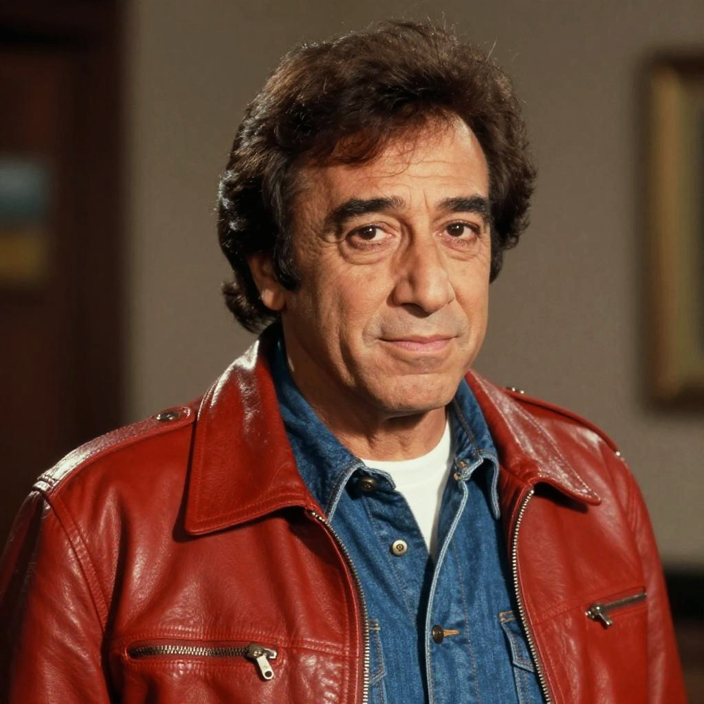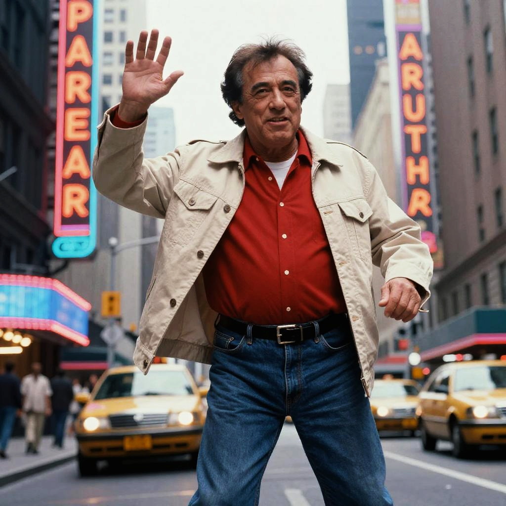 Danny DeVito young in casual 1980s outfit, bright neon cityscape, energetic pose, dynamic composition, film grain effect, lively urban atmosphere, authentic vintage look