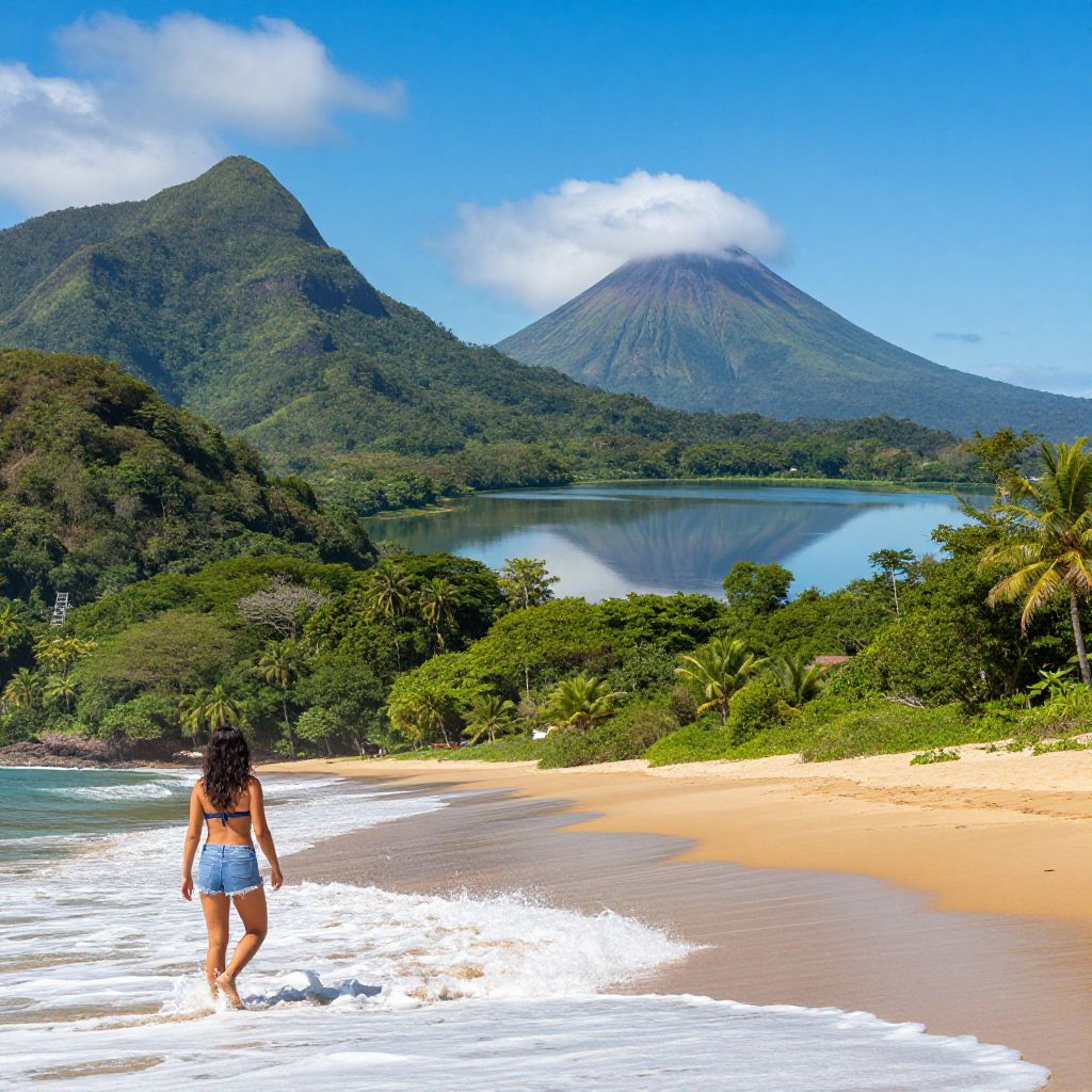 Photograph of a tropical beach scene featuring a woman with long dark hair and a tan skin tone, wearing a black bikini top and denim shorts, walking away from the camera towards the ocean. The sandy shore has gentle waves lapping at it. In the background, lush green trees surround a calm blue lake, with two large, mist-covered mountains rising above. The sky is clear and blue, with a few clouds near the mountains. Palm trees are visible on the right side of the image.