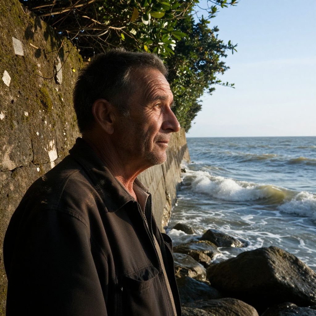 Photograph of an older man with short, gray hair, wearing a dark shirt, standing by a rocky seaside wall, looking at the ocean under bright