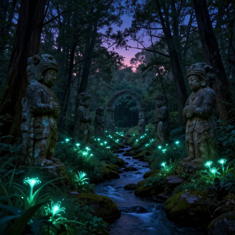 Photograph of a mystical forest at dusk, featuring glowing green plants, stone warrior statues, and a flowing stream, with a twilight sky in the background