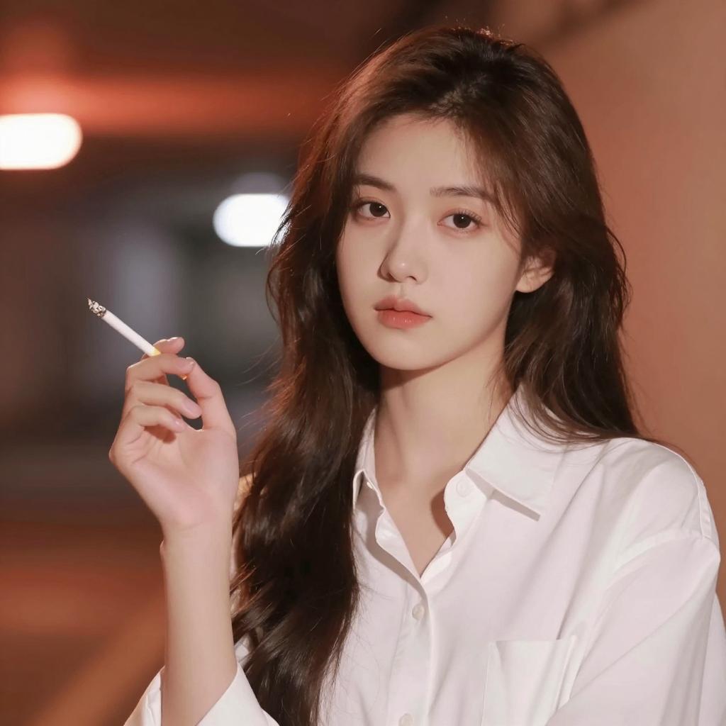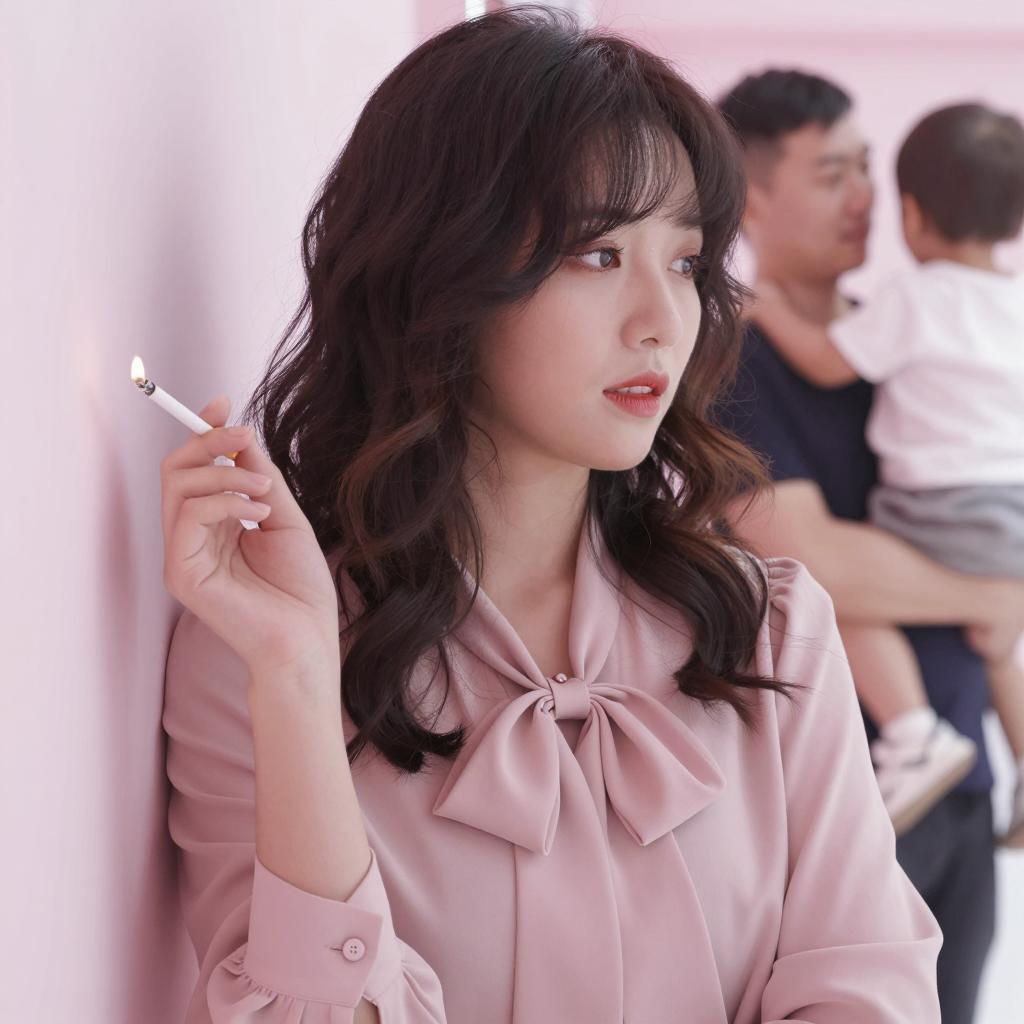 Asian woman with dark wavy hair and bangs wearing a pale pink blouse with a decorative bow, holding a lit cigarette in her right hand. She leans against a light pink wall, looking to the side. In the blurred background, a man holds a child, creating a contrast between the foreground and family scene behind.