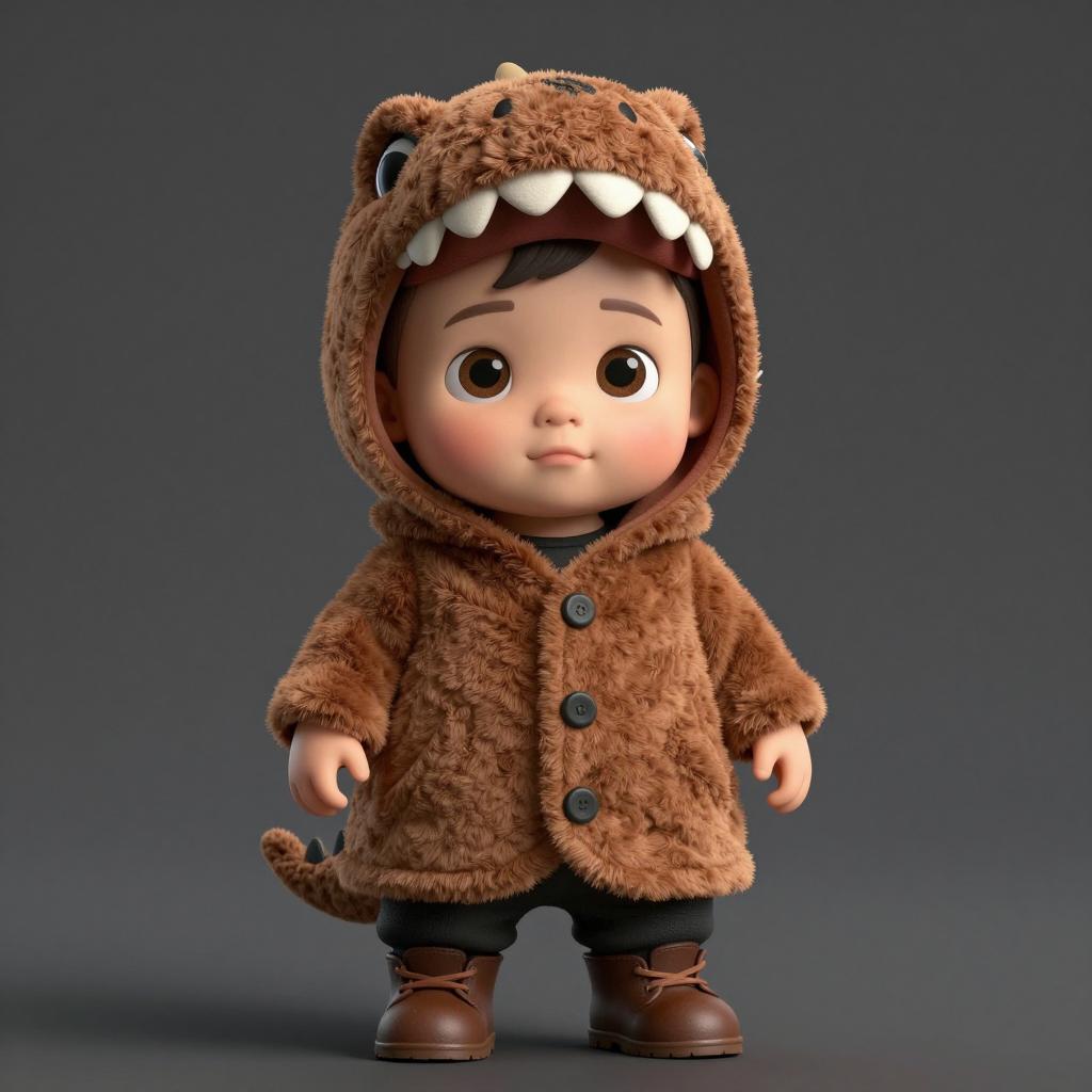 Jaws character costume, photorealistic, digital art, baby with large eyes, standing, wearing brown coat with open hood, dinosaur mouth hood, black outfit underneath, brown boots, hands in pockets, neutral expression, dark gray background, soft lighting, detailed ures, realistic shadows, child-like innocence, whimsical and cute, hyper-realistic, CGI style