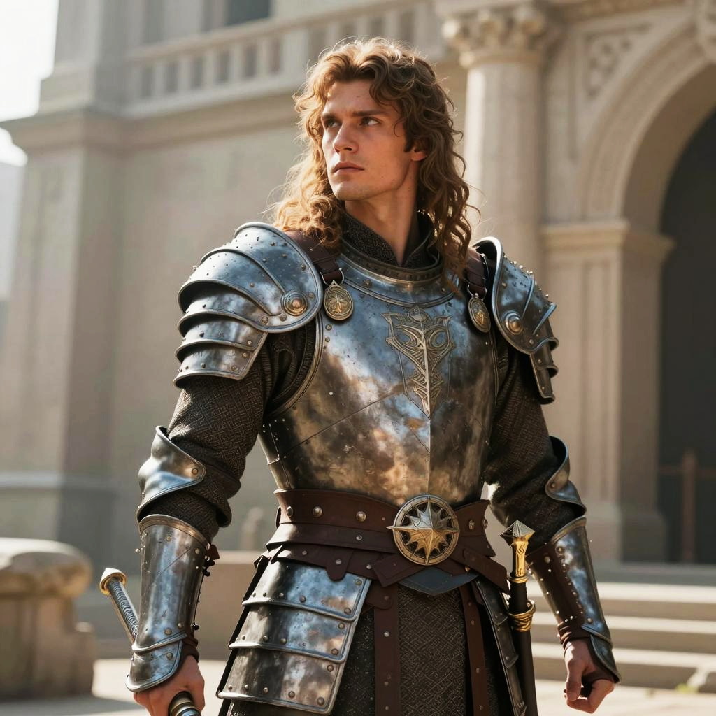 A male figure wearing detailed medieval-inspired armor with metallic and leather elements, standing confidently against ancient stone architecture. The subject has long curly hair and a determined expression, embodying a fantasy hero ready for battle. The setting suggests a historic or fantasy-themed environment with stone columns and arches.