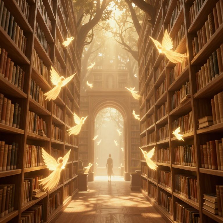 An ethereal 3D-rendered library bathed in warm, golden lighting features towering bookshelves filled with sentient books whose pages flutter like wings, accompanied by luminous, floating archivists that drift gracefully through the misty, tree-lined corridor leading to an open archway.