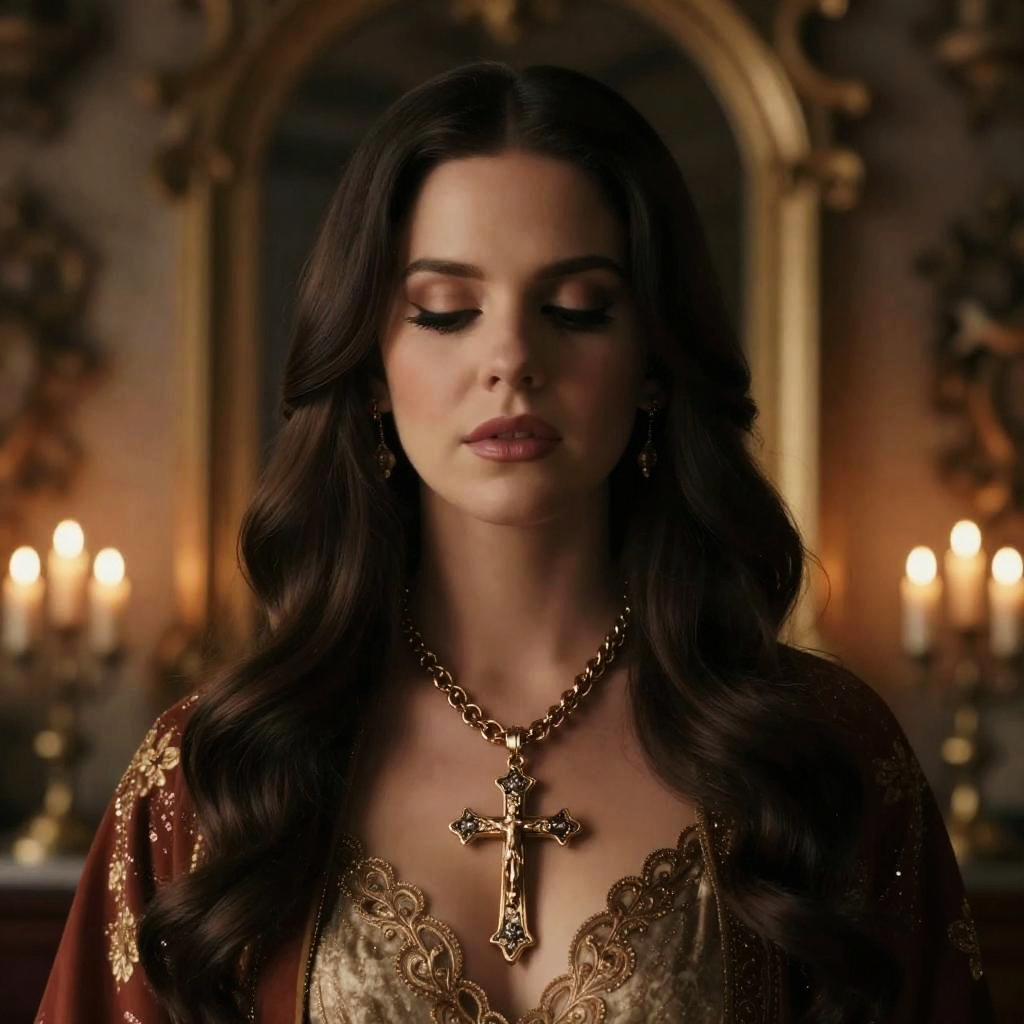 Portrait of Lana Del Rey religious symbolism, ornate crucifix necklace, serene face, baroque interior, candlelight glow, rich textures, moody and spiritual vibe