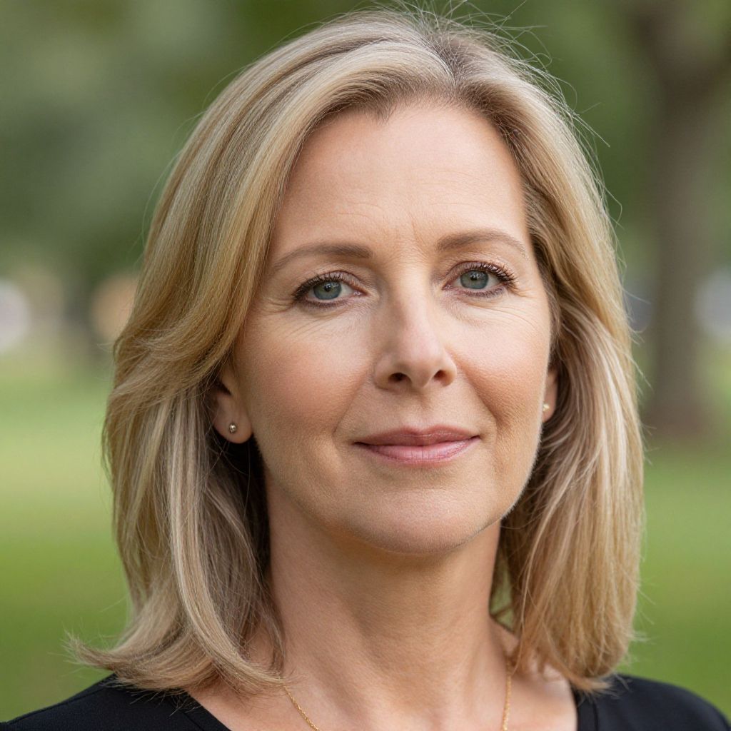 Close-up portrait of a middle aged Caucasian woman with blonde hair and blue eyes, wearing small earrings and a black top, smiling serenely while outdoors in a blurred park background.