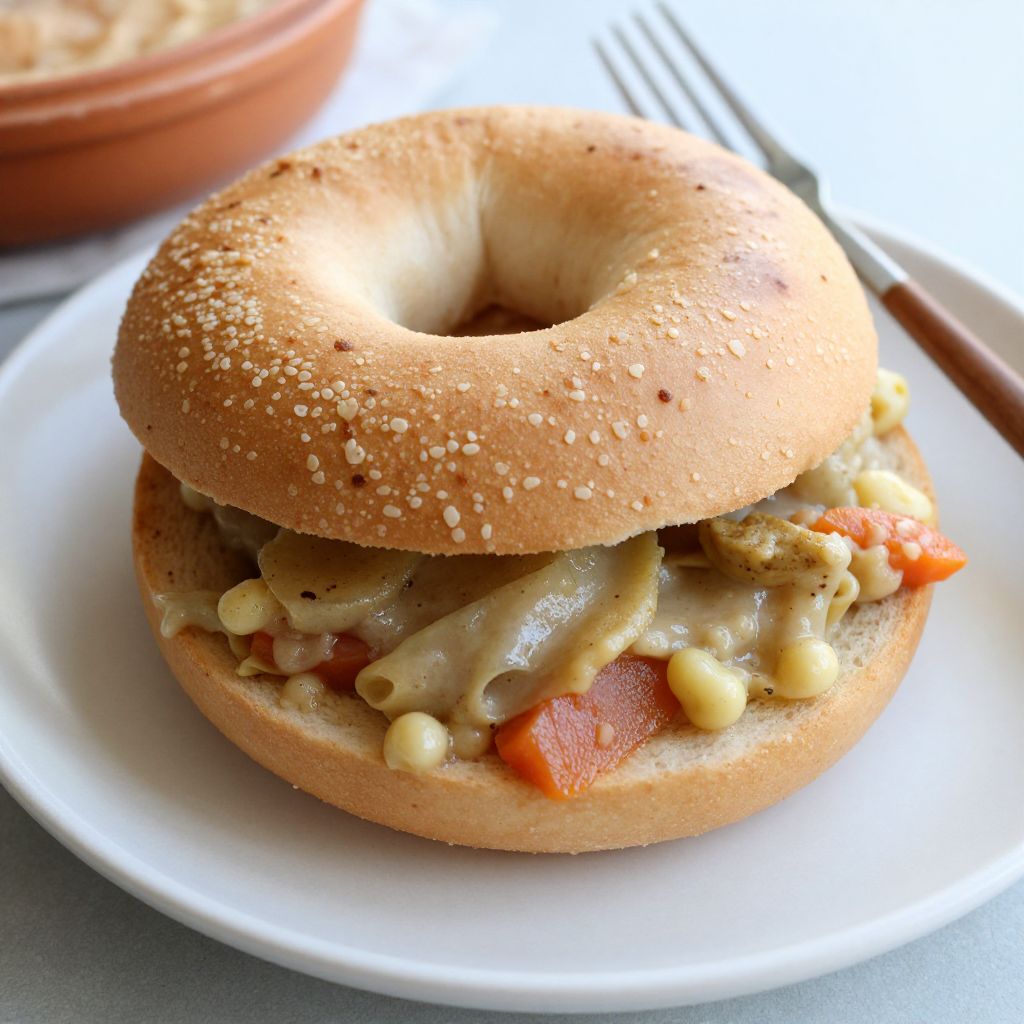 Photograph of a close-up, freshly-made sandwich on a white plate. The sandwich features a golden-brown sesame seed bagel, split in half and filled with creamy macaroni and cheese, diced red bell peppers, and small pieces of bacon. The texture of the bagel is soft and slightly chewy, contrasting with the gooey macaroni and cheese. In the blurred background, there is a red ceramic bowl and a metallic spoon, placed on a grey surface. The lighting is bright, highlighting the sandwich's ingredients and textures.