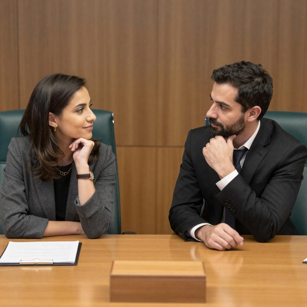 Photograph of a man and woman in a wooden-paneled conference room. The man, with a beard and black suit, rests his chin on his hand, looking at the woman. She has dark hair, wears a gray jacket, and rests her chin on her hand, smiling. Documents and a wooden box are on the table between them. Green upholstered chairs are in the background.