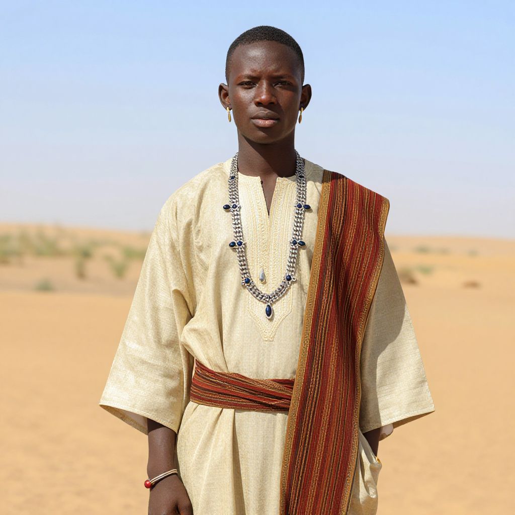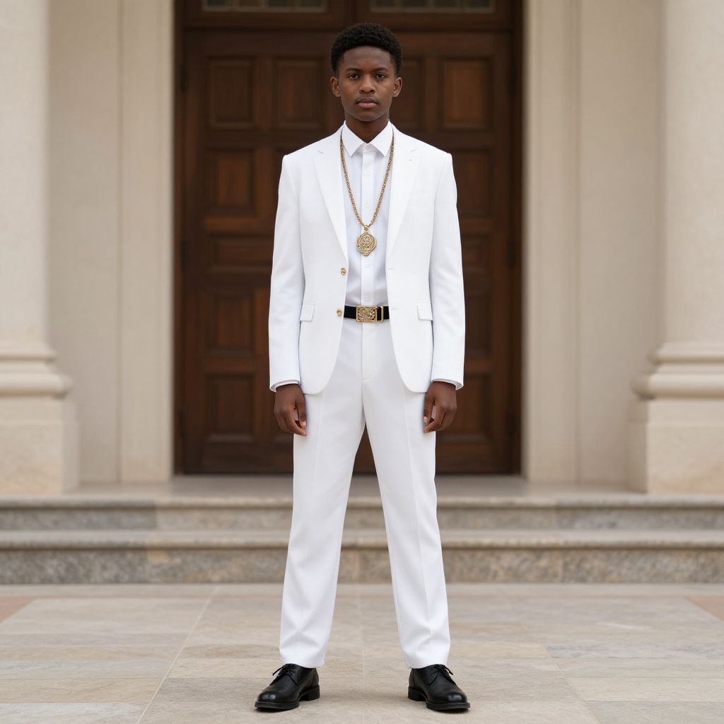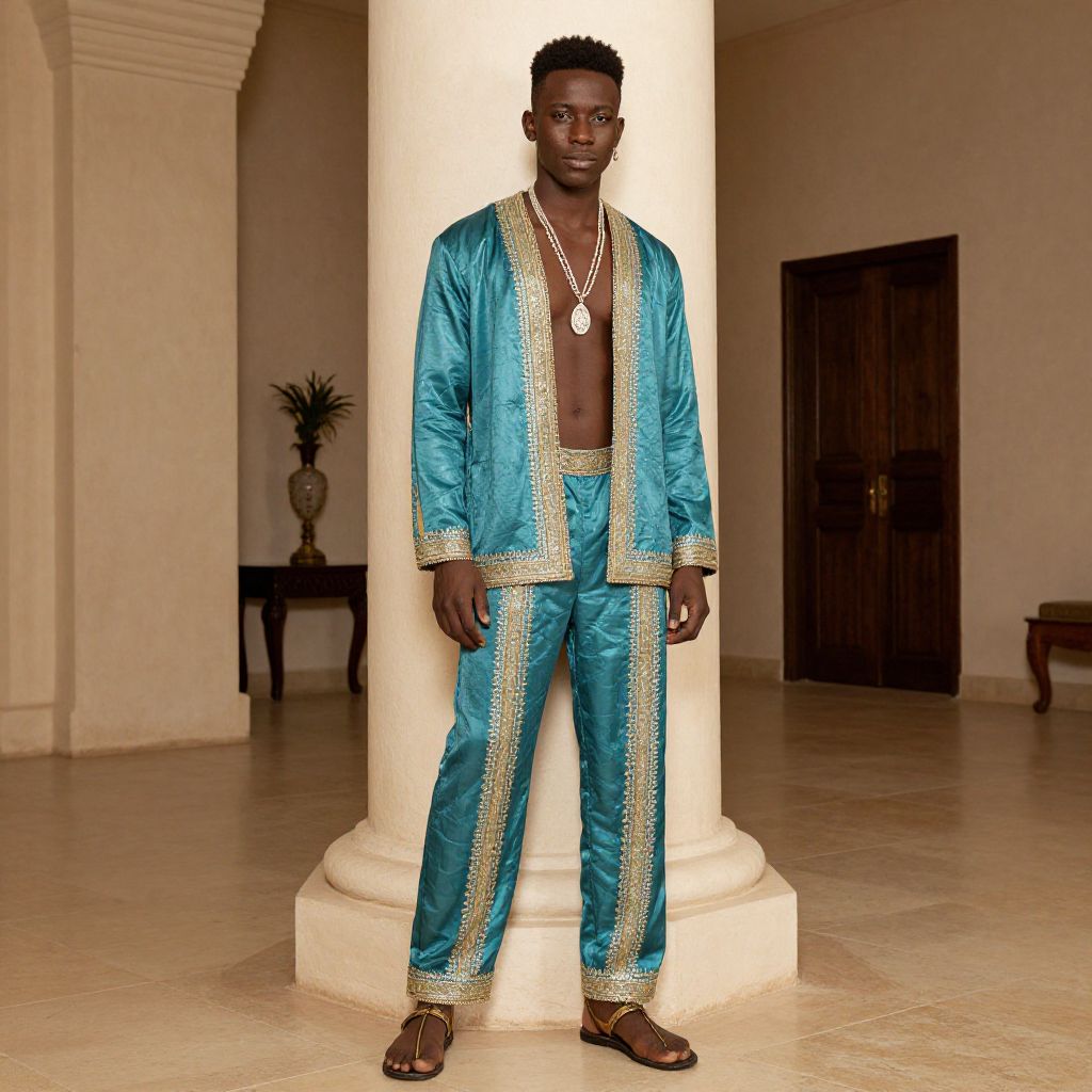 Casablanca clothing costume, solo, 1boy, male focus, jewelry, necklace, sandals, pillar, standing, full body