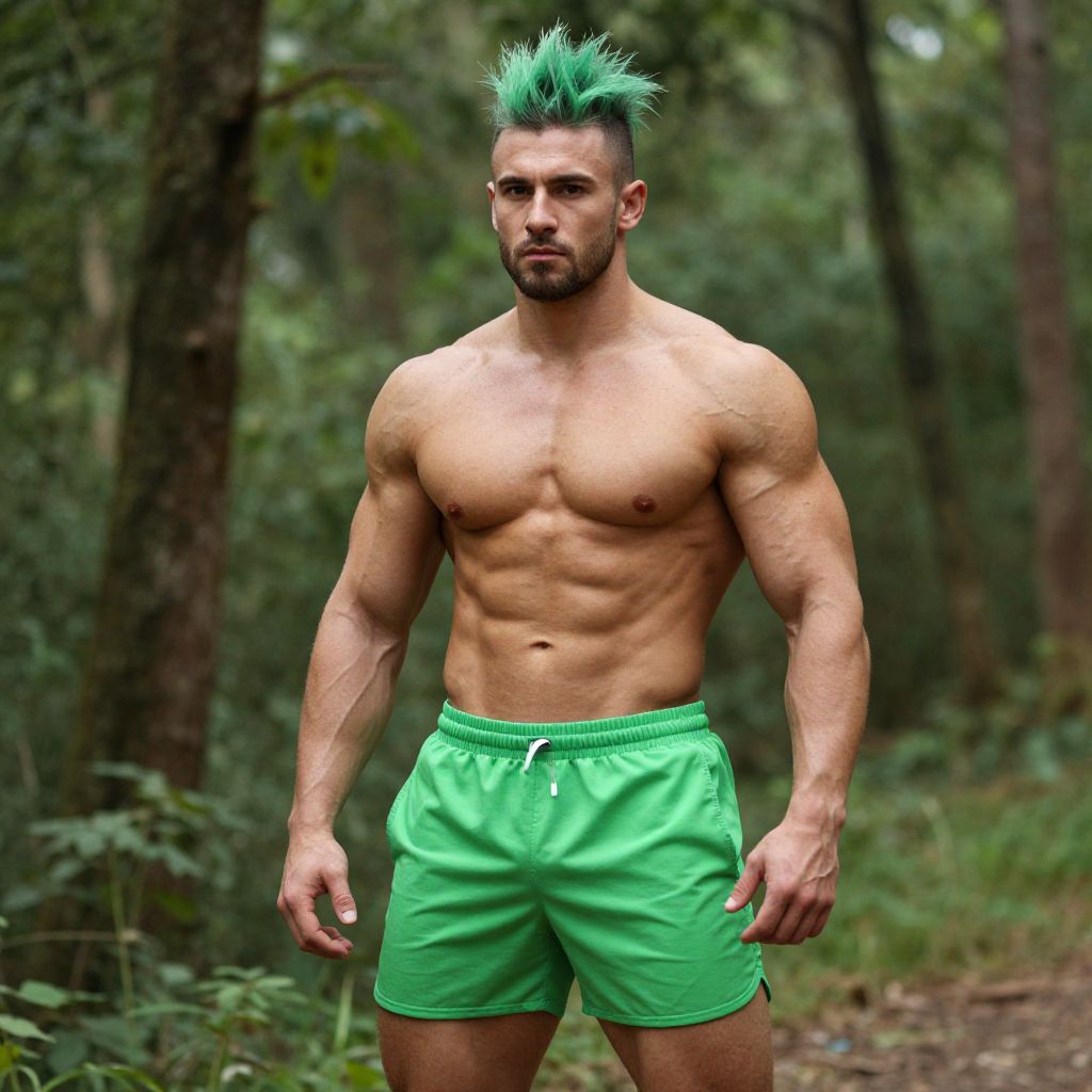 A muscular man stands confidently in a lush forest, showcasing his strong physique in a vibrant green athletic outfit. The unique spiked green hairstyle adds a striking element to his bold look, perfectly complementing the natural surroundings. This image captures the essence of fitness and vitality against a serene backdrop.