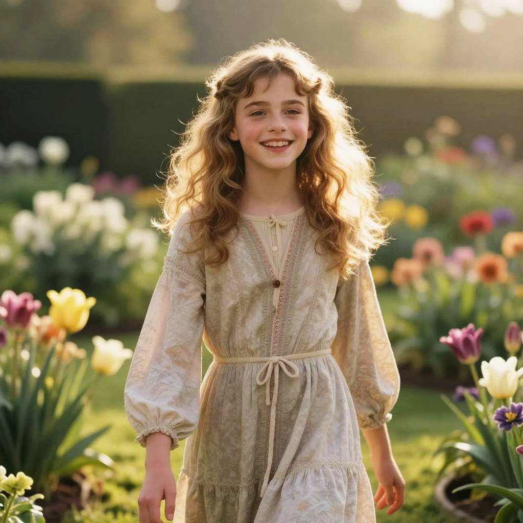 Hermione smiling brightly in a serene garden at dawn, vibrant flowers blooming around her, soft sunlight creating a gentle halo effect, wearing a flowing dress with natural earthy tones, capturing a moment of peaceful magic and youthful joy.
