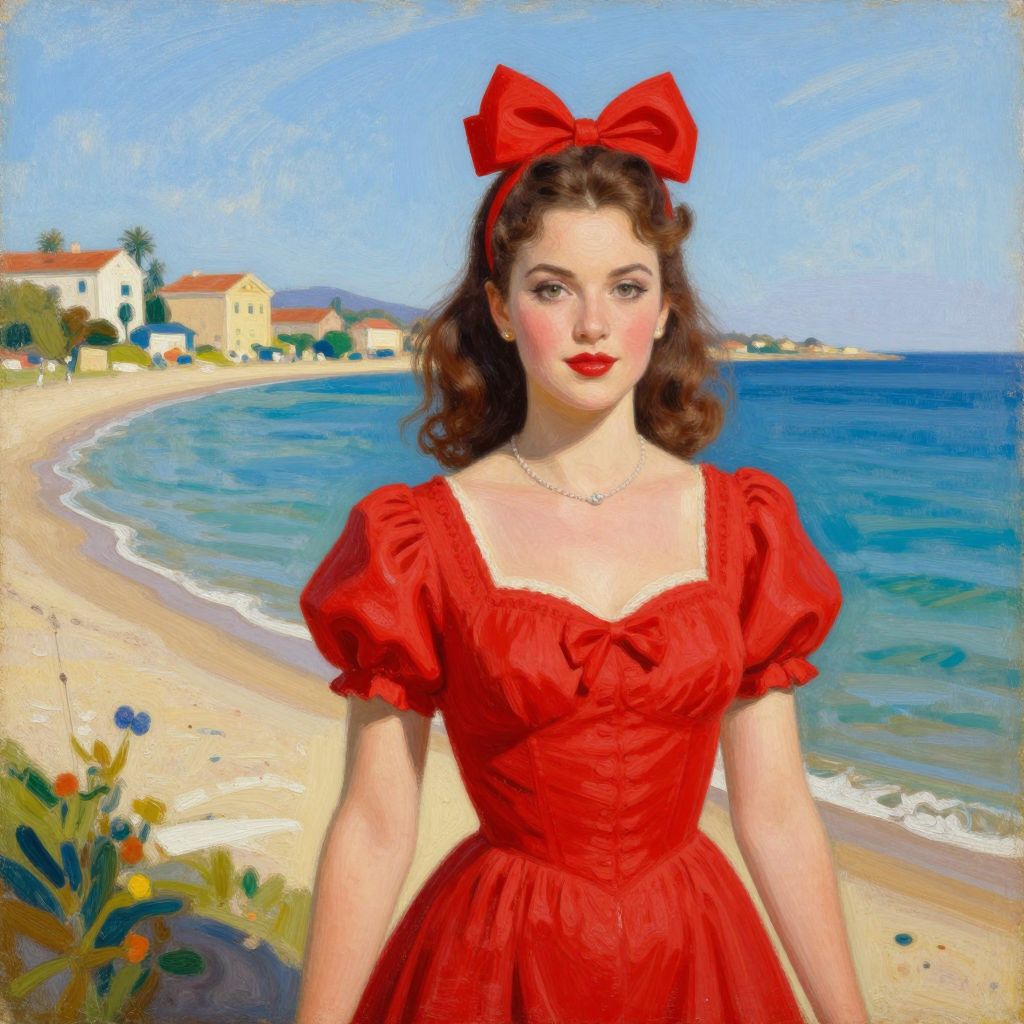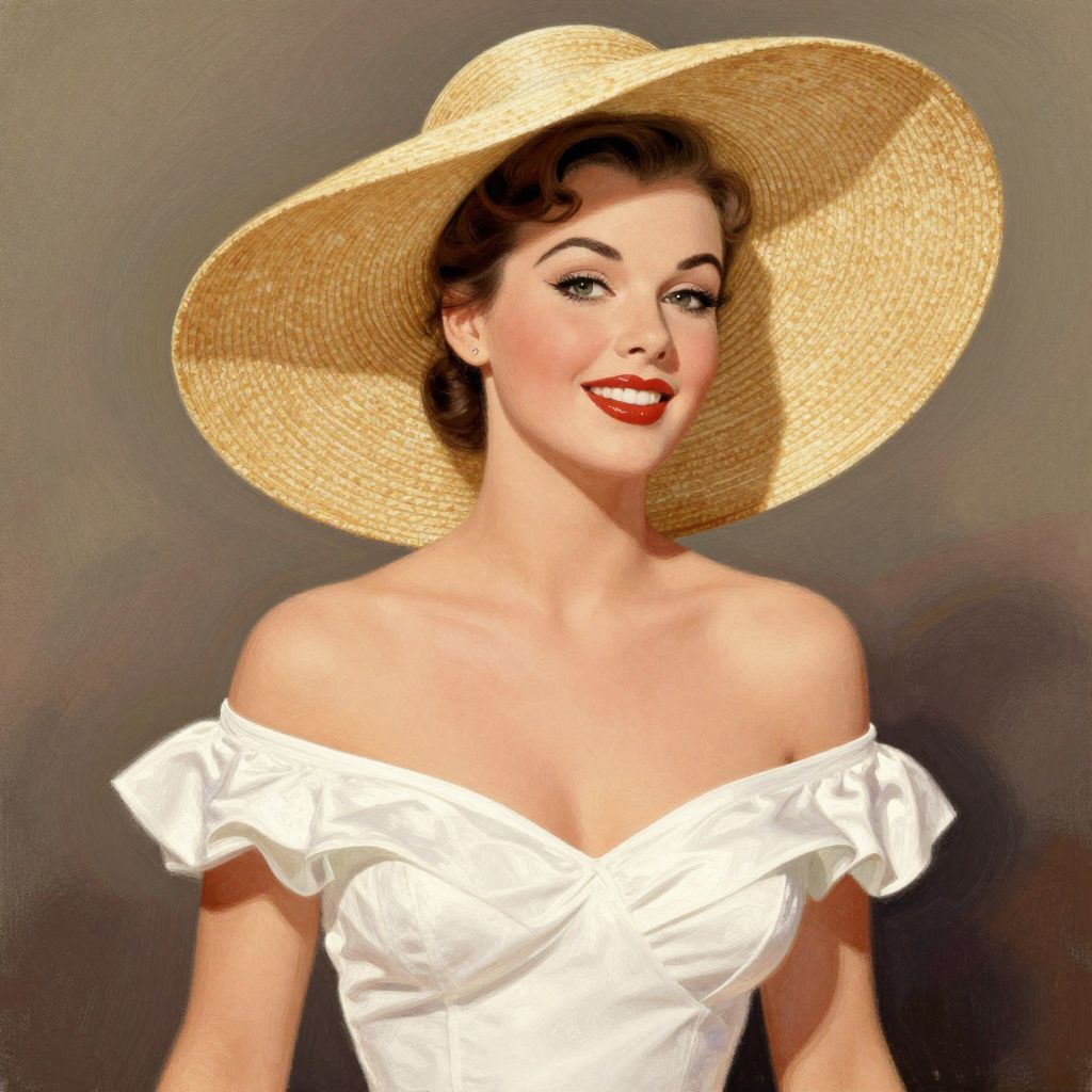 Vintage-style digital illustration of a fair-skinned woman with red lipstick, wearing a wide-brimmed straw hat and off-shoulder white blouse,