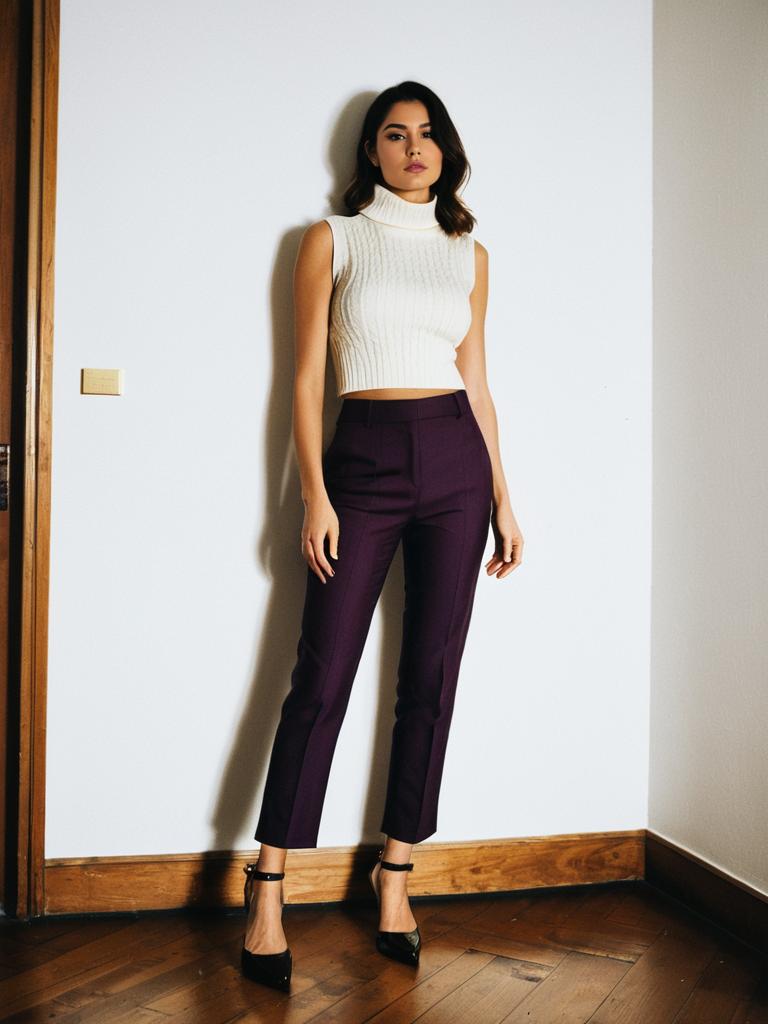 Woman, contemporary casual, fitted henley crop top in raspberry red with buttons and three-quarter sleeves, high-rise tapered jogger pants in charcoal grey with drawstring, black slip-on loafers with decorative silver buckle, urban alley with brick walls and shaded trees. Sexy body, big breasts. --sref 1399