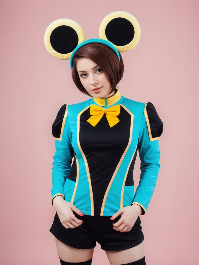 Young woman wearing a detailed Tron Bonne cosplay outfit consisting of a blue, black, and yellow bodysuit with puffed sleeves, a yellow bow tie, black shorts, and a headband featuring large circular ears. The photo is set against a solid pink background.